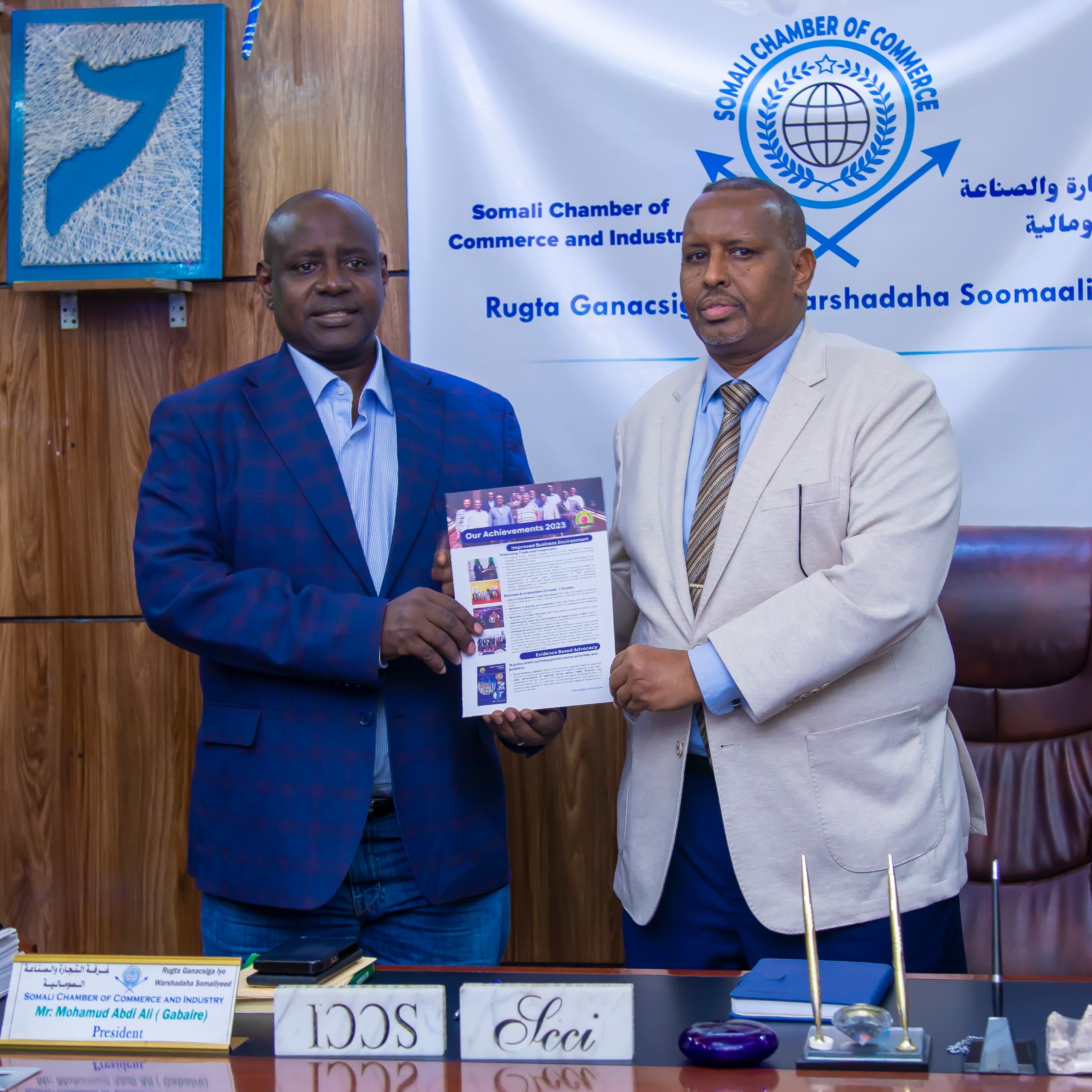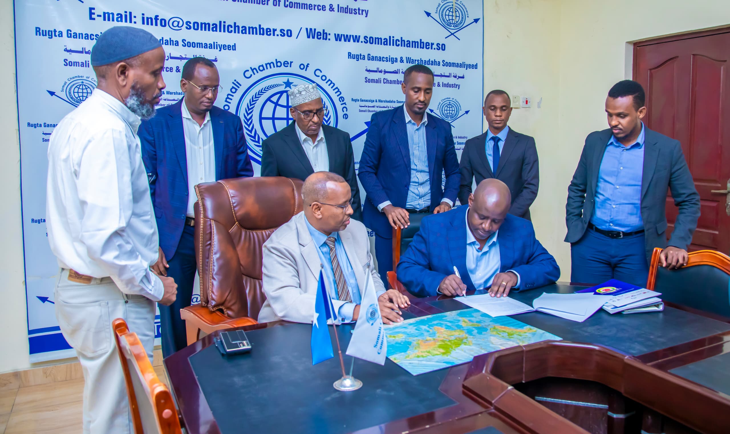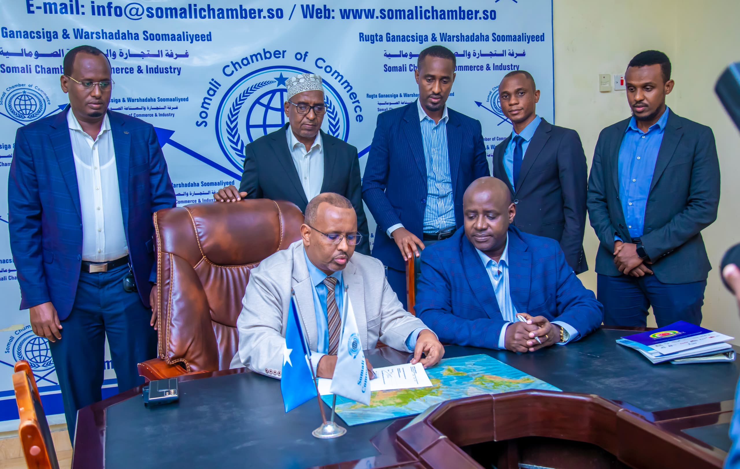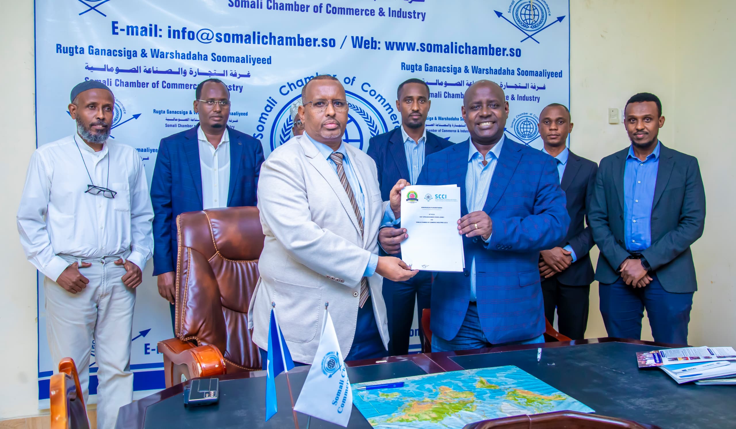 EABC CEO John Bosco Kalisa, accompanied by Zephania Shaid, Membership and Business Development Manager at EABC, and Moses Kanyesigye, Regional SME & Youth Coordinator at EABC, was warmly welcomed by Mohamoud Abdi Ali, the President of the Somalia Chamber of Commerce and Industry. During the signing ceremony, Mr. Kalisa underscored the council’s commitment to supporting the Somali business community in attracting investors and building strategic partnerships. He emphasized that the SCCI would be granted National Focal Point Status to facilitate streamlined coordination and collaboration.