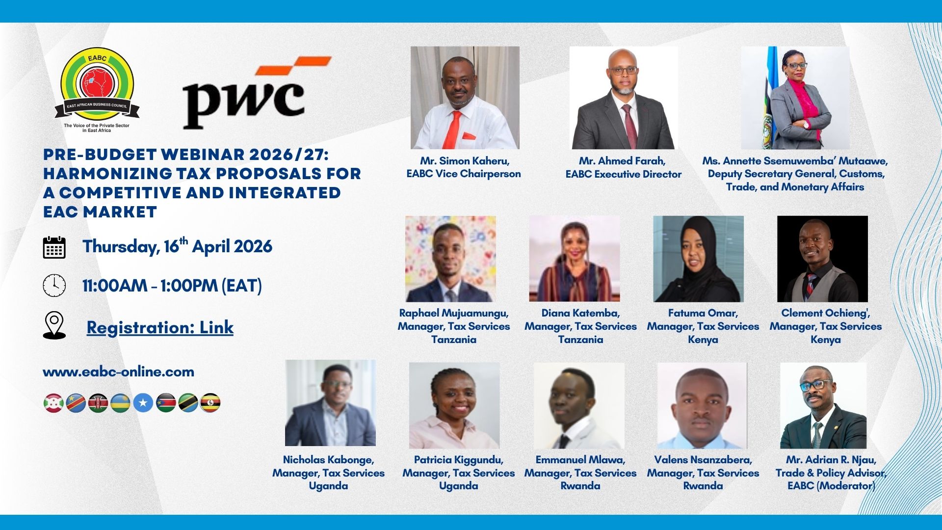 This call was made during the EABC Pre-Budget Webinar 2026/27 themed “Harmonizing Tax Proposals for a Competitive and Integrated EAC Market,” convened by the East African Business Council (EABC) in collaboration with PwC on 16th April 2026.